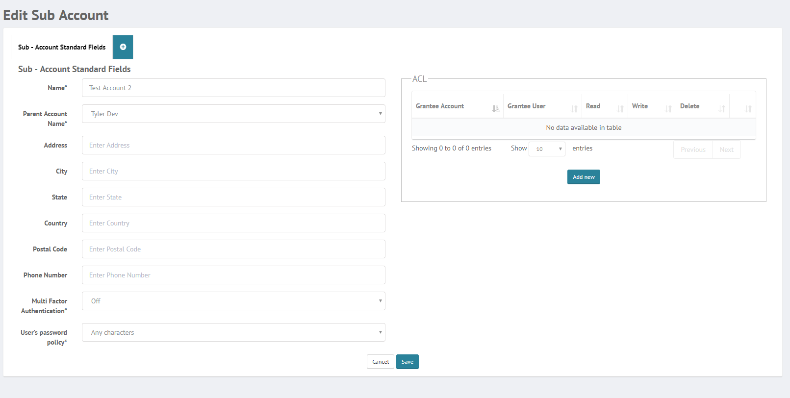 Here is the 'Edit Sub Account' page. On the right side, there is a panel for adding and editing ACLs.
